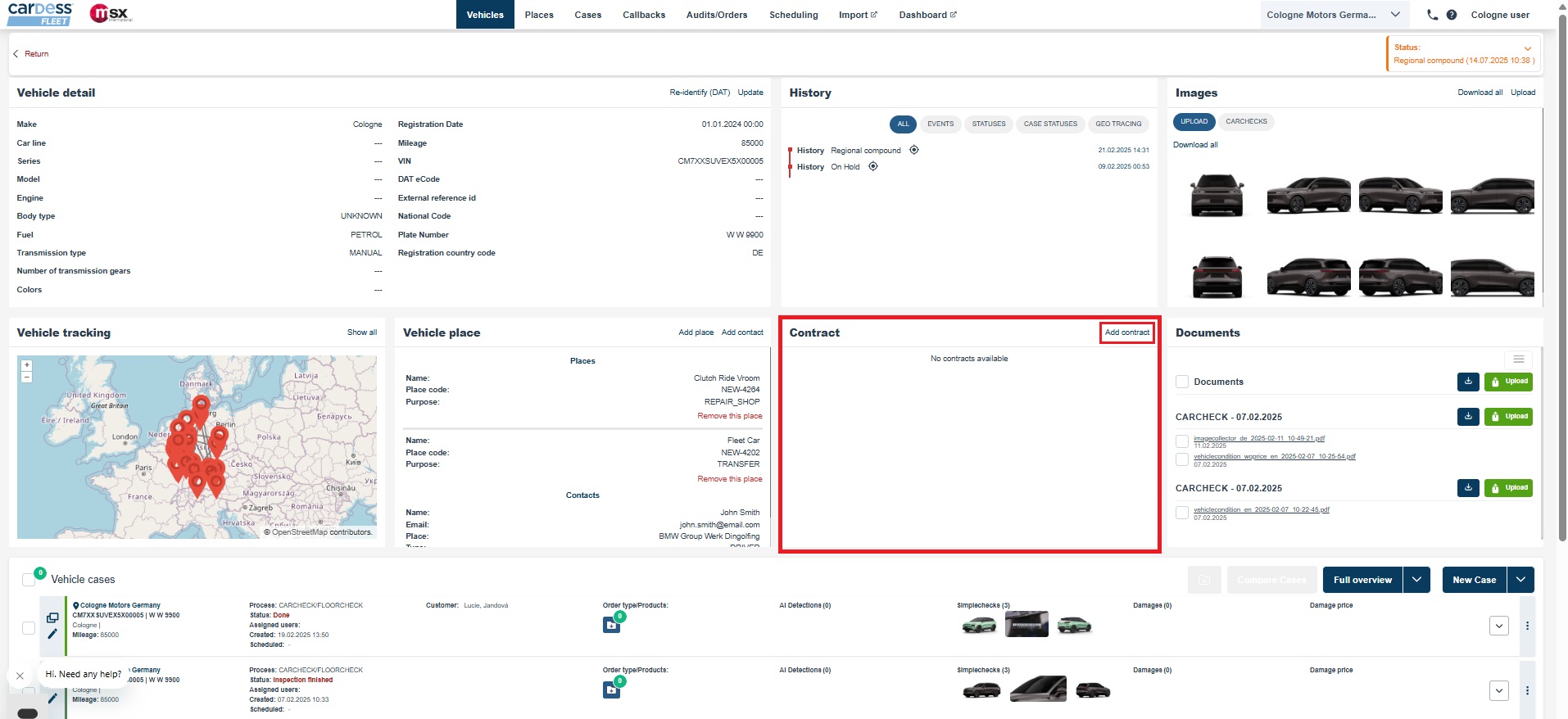 You are able to update vehicle status manually from the top bar (e.g., Regional compound, On Hold), with changes recorded in history for tracking and customer updates.