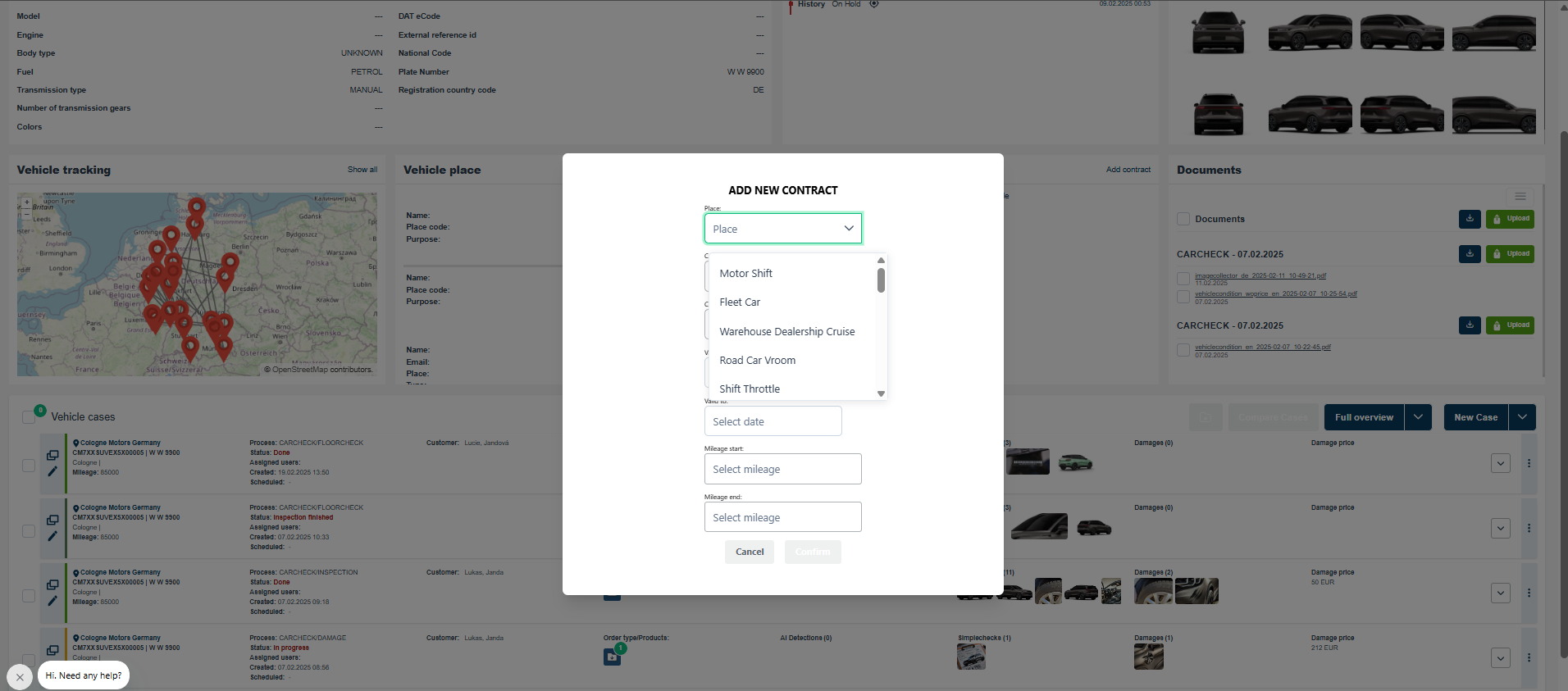 After you navigate to Vehicles in the top menu bar, you see the list of vehicles with details like photo, brand/model/line, VIN, license plate, first registration date, age & mileage, car status, tracker, last position, no. of cases/car checks/docs/pictures, order date.